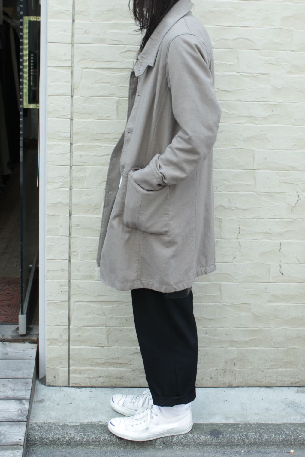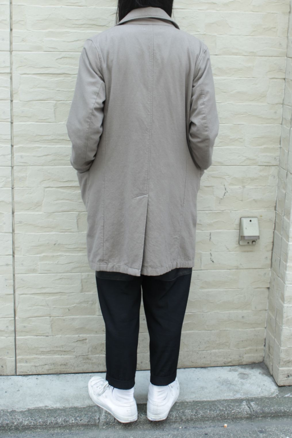 nonnative 13AW DOCTOR COAT 2014/04/13 こちらはコットンウール地のスタンドカラーコートです。 ボタンの留める位置で襟のシルエット変化を楽しんでいただけます。 起毛した生地感が味のある1着です。 YADA身長175cm、体重60kg