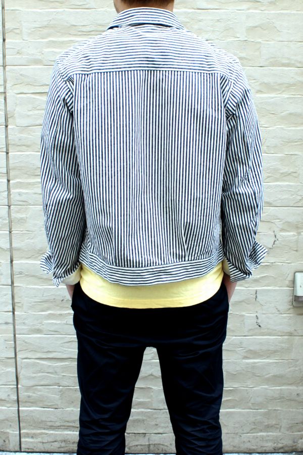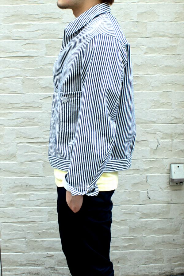 Scye 14SS Hickory Stripe Short Coverall 2014/05/25 ヒッコリー生地が可愛らしいカバーオールです。 すっきりとしたショート丈で、現代的なシルエットに。 胸ポケットのオリジナルアルミパッチが魅力的な1着です。 TOMY身長174cm、体重65kg