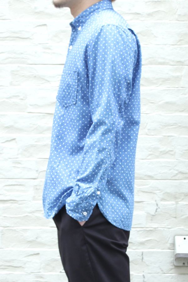 nonnative 14SS DWELLER B.D. SHIRT – COTTON CHAMBRAY DOT 2014/06/11 nonnative 14SS DWELLER B.D. SHIRT – COTTON CHAMBRAY DOT 綺麗なインディゴに染め上げてからドットの部分の色を抜いています 丸みのある裾や、斜めに配置された袖のボタンはブランドお馴染みのデティール ドット柄が梅雨の時期にぴったりな一着です TOMMY身長174cm、体重65kg