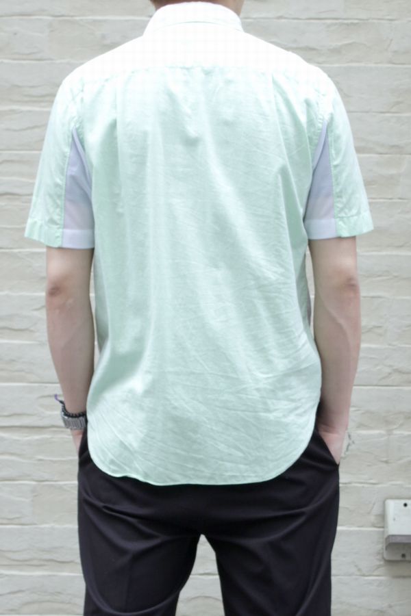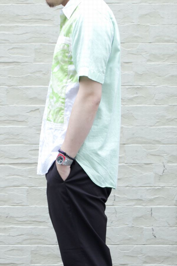 GANRYU 13SS 迷彩柄ドビー半袖シャツ 2014/06/11 GANRYU 13SS 迷彩柄ドビー半袖シャツ 柄や生地の配置が魅力的な半袖シャツ 身頃はアロハシャツでよく用いられるコットンドビー、カモフラのテキスタイルにはコットンブロードを使い、さらに脇はメッシュで切り替えるなど素材使いに抜かりがありません 爽やかな印象のマスカットカラーやカモフラ柄がこれからの季節にオススメ TOMMY身長174cm、体重65cm