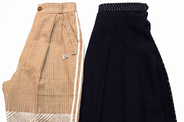 左から ジャージみたいなスラックス、手縫いプリーツスカート