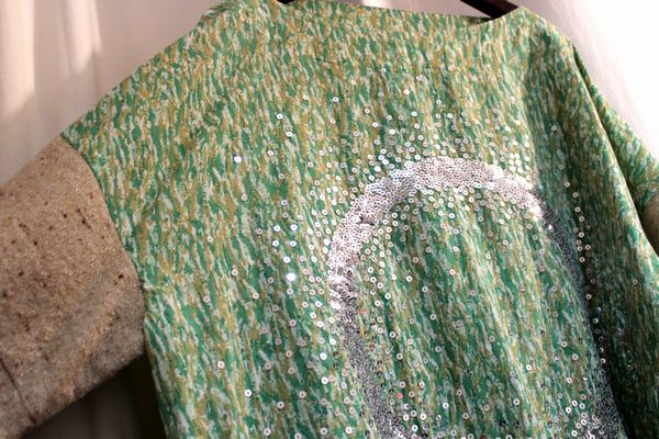袖がウール切替になっており、フロントにはグラデーションスパンコールの