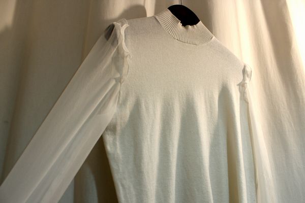 繊細かつ女性的な細部で魅せるハイネックニット!