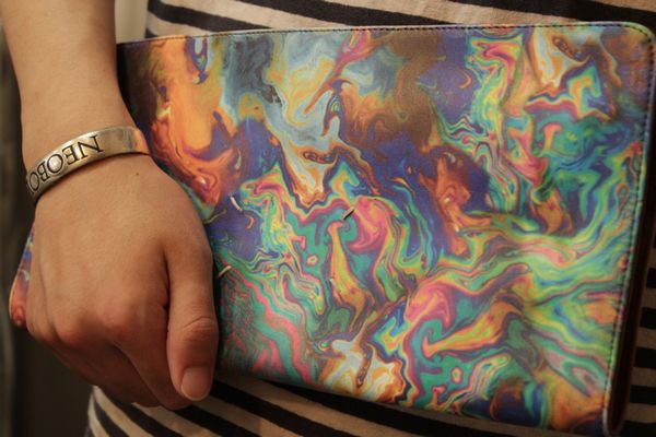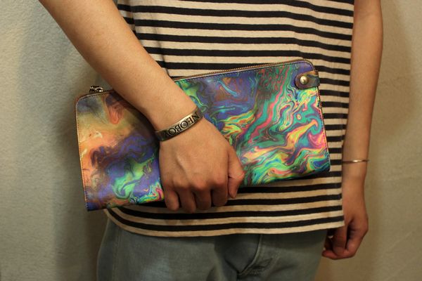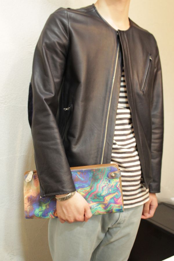 URU ライダース / MartinMargiela クラッチバッグ 2013/07/22 13SS URU レザーライダース ノーカラーのスタイリッシュなデザイン まぬけな姿が窓に映ってしまいました、、、 スエードのエルボーパッチが効いています 洗練されています。 本日19時より販売です。 URU レザーライダースジャケット 只今販売中のマルタンマルジェラのクラッチバッグと合わせてみました。 絶妙なマーブルカラーリング マルタンマルジェラ クラッチバッグ YASU身長182cm