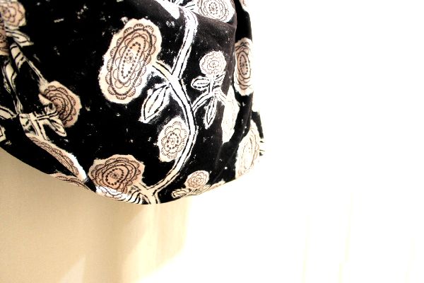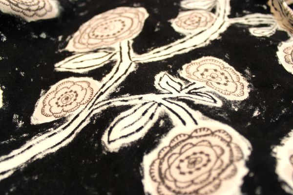 花たちが規則的にそしてそれぞれの表情で踊るように咲いている様子を描いたテキスタイル。