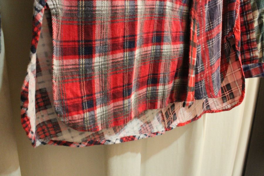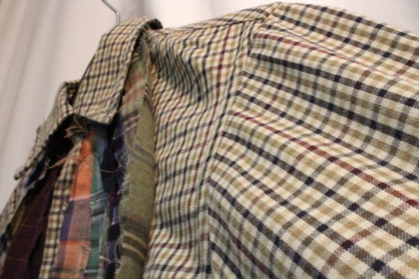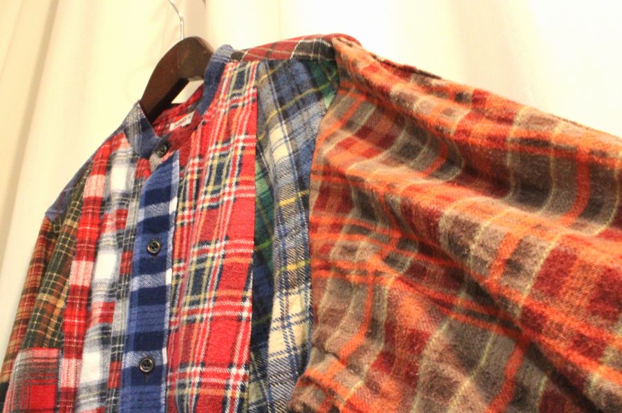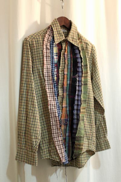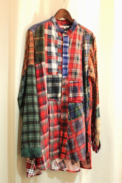 様々なフランネルシャツを分解し、ノーカラーのバンドカラーシャツに作り直されたデザインで、細かくパーツ分けし、それぞれ違う柄のチェック柄を組み合わせています。